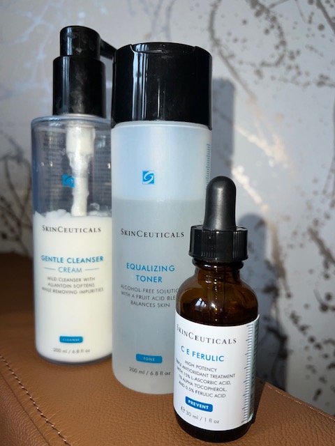 So let’s start with my morning routine. I cleanse with Skinceuticals Gentle Cleanser and follow with Skinceuticals Equalizing Toner. While my skin is still slightly damp I use my holy grail vitamin C product also by Skinceuticals, CE Ferulic. I ran out of this a while ago and only recently bought a new one and I can see the difference in my skin. It is so much calmer, clearer and more glowy when I use this product. Highly recommend although it is pricey it is worth it in my opinion. Next I use a hyaluronic acid serum, I like a lot of different hydrating serums but at the moment I am using Medik8 Liquid Peptides and I am enjoying it, I seal the serum in with Obagi Hydrate and always always always use La Roche Posay Hydrating Cream SPF 50 every day as my last step.